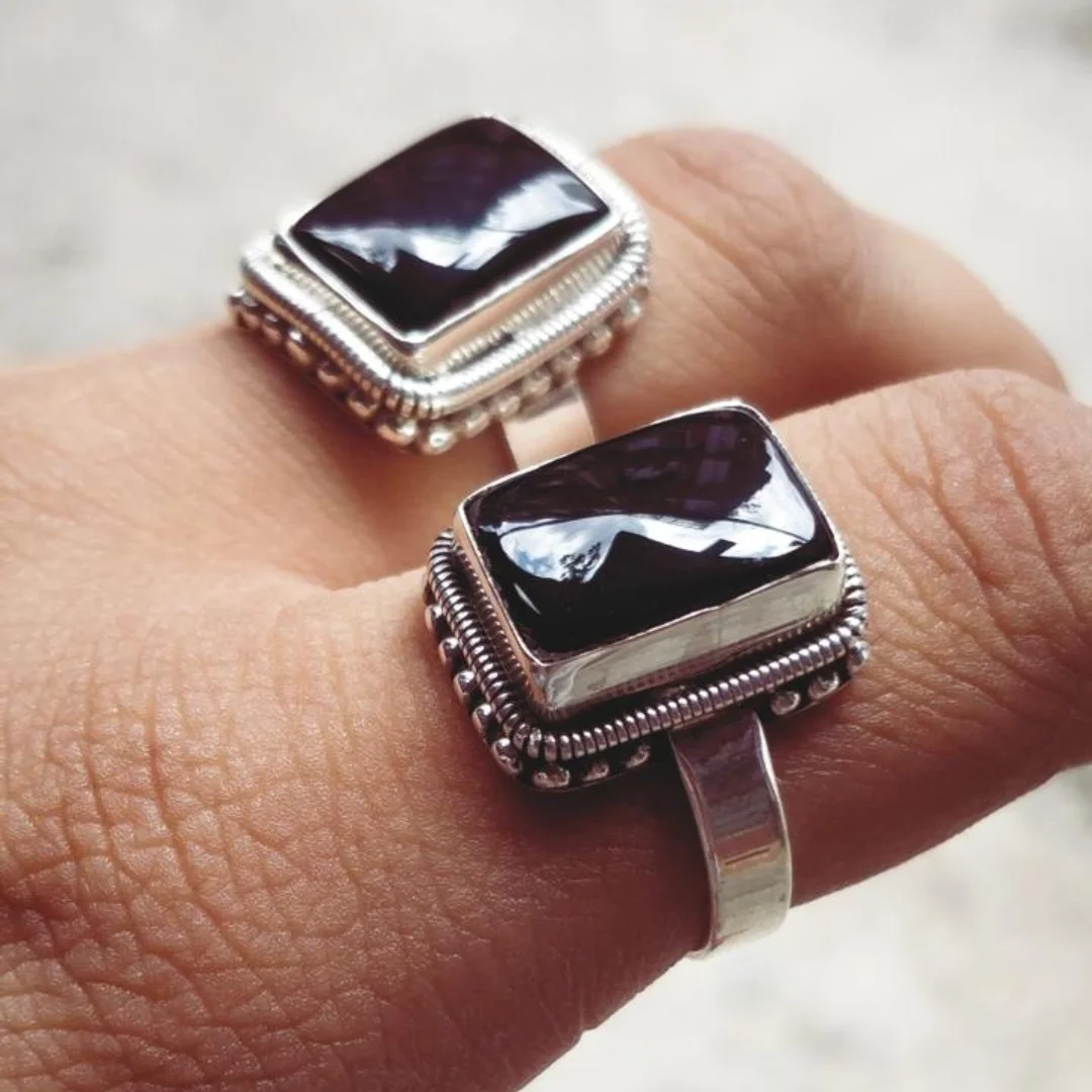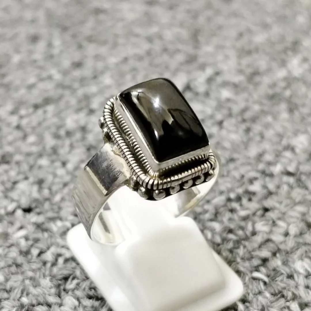Product Description: Unveil the mystique of the “Lucifer’s Onyx Elegance Ring,” a pure silver creation that captures the essence of enigmatic charm. This ring features a large, rectangular black onyx stone, its dark allure set against the lustrous sheen of silver. Intricate rope-like details encircle the onyx, adding a touch of sophistication to the design.